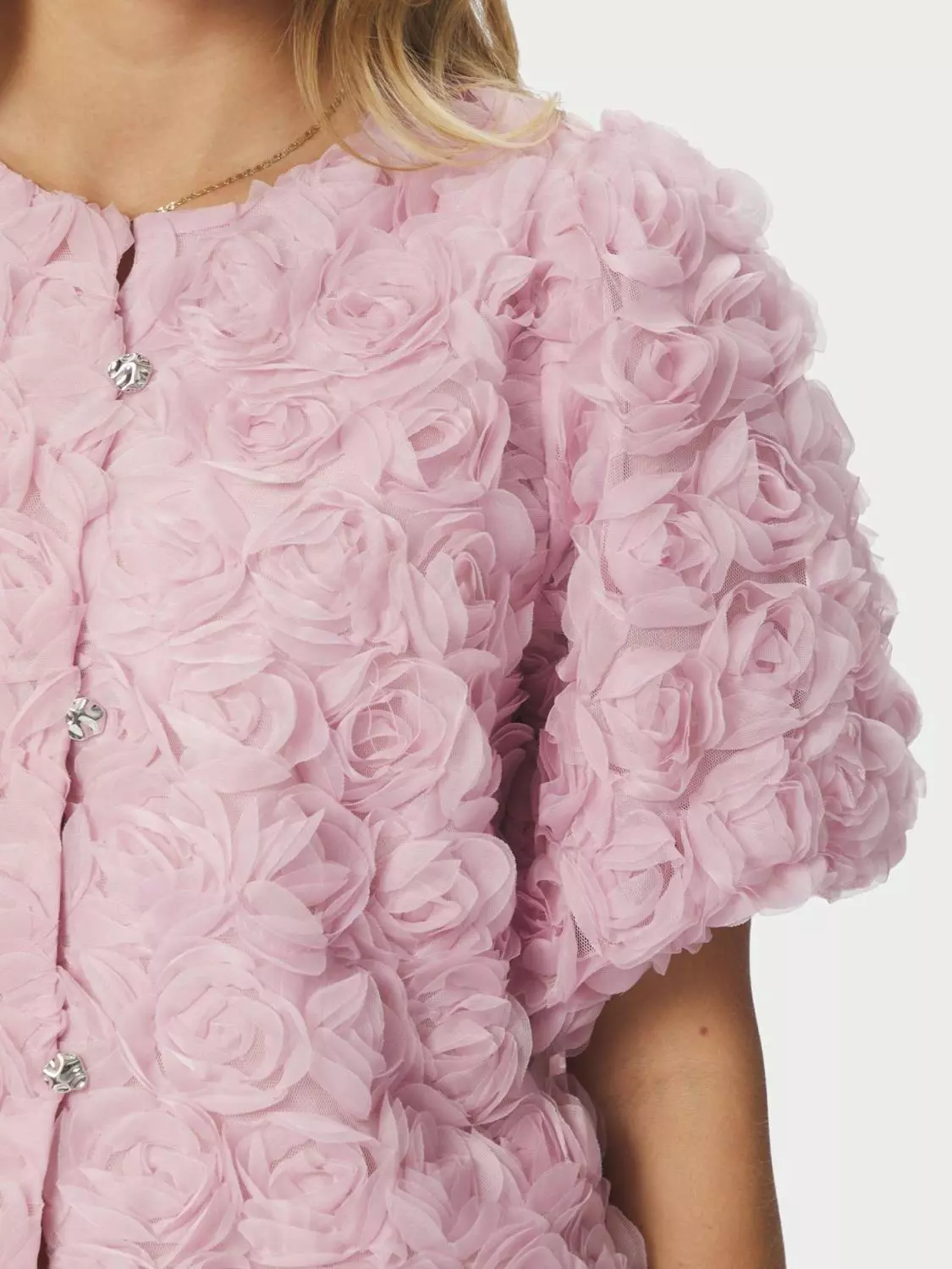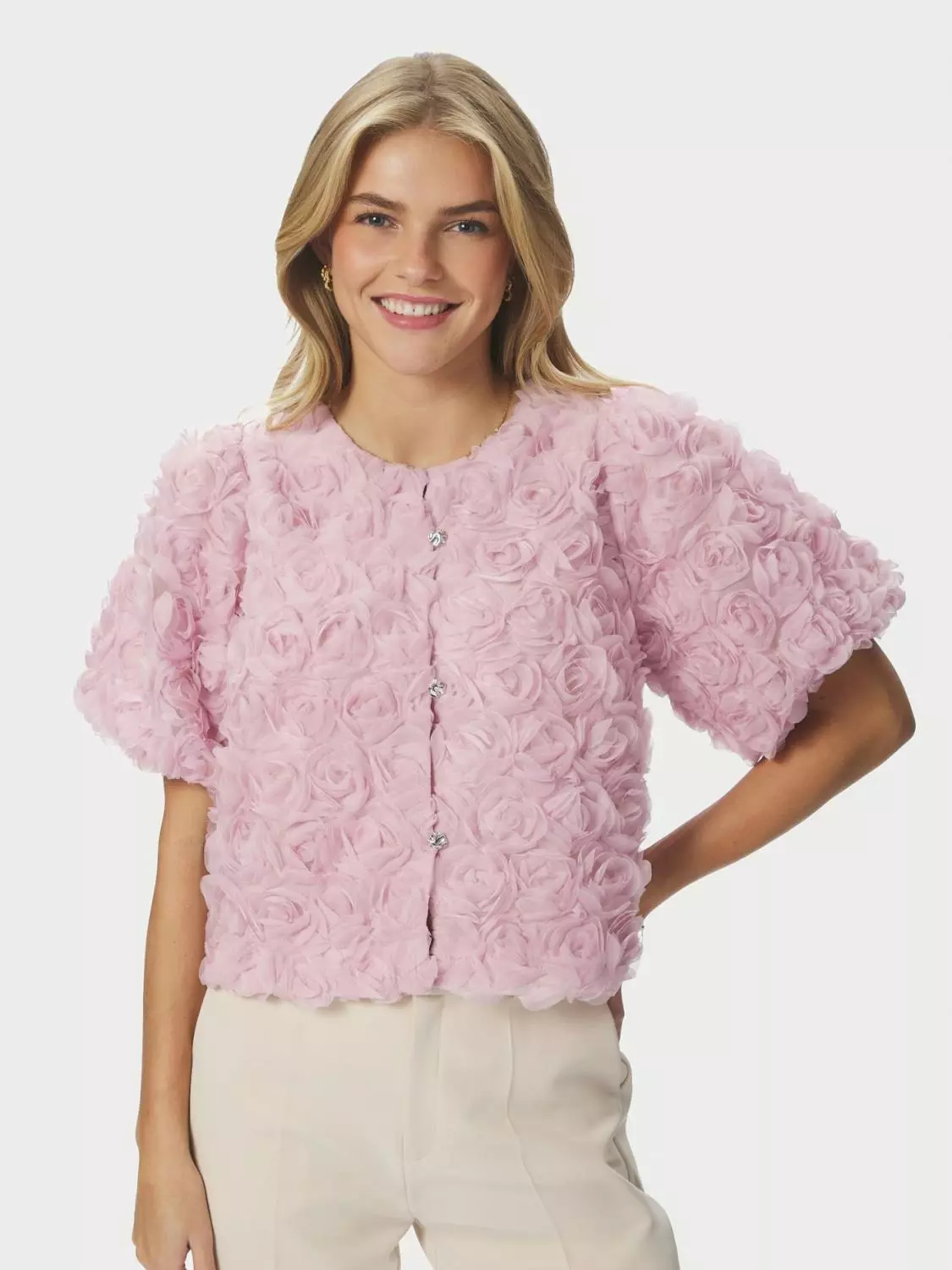 Søt topp med løse korte ermer og knappelukking foran. Modellen er 176 cm høy og bruker størrelse 36.