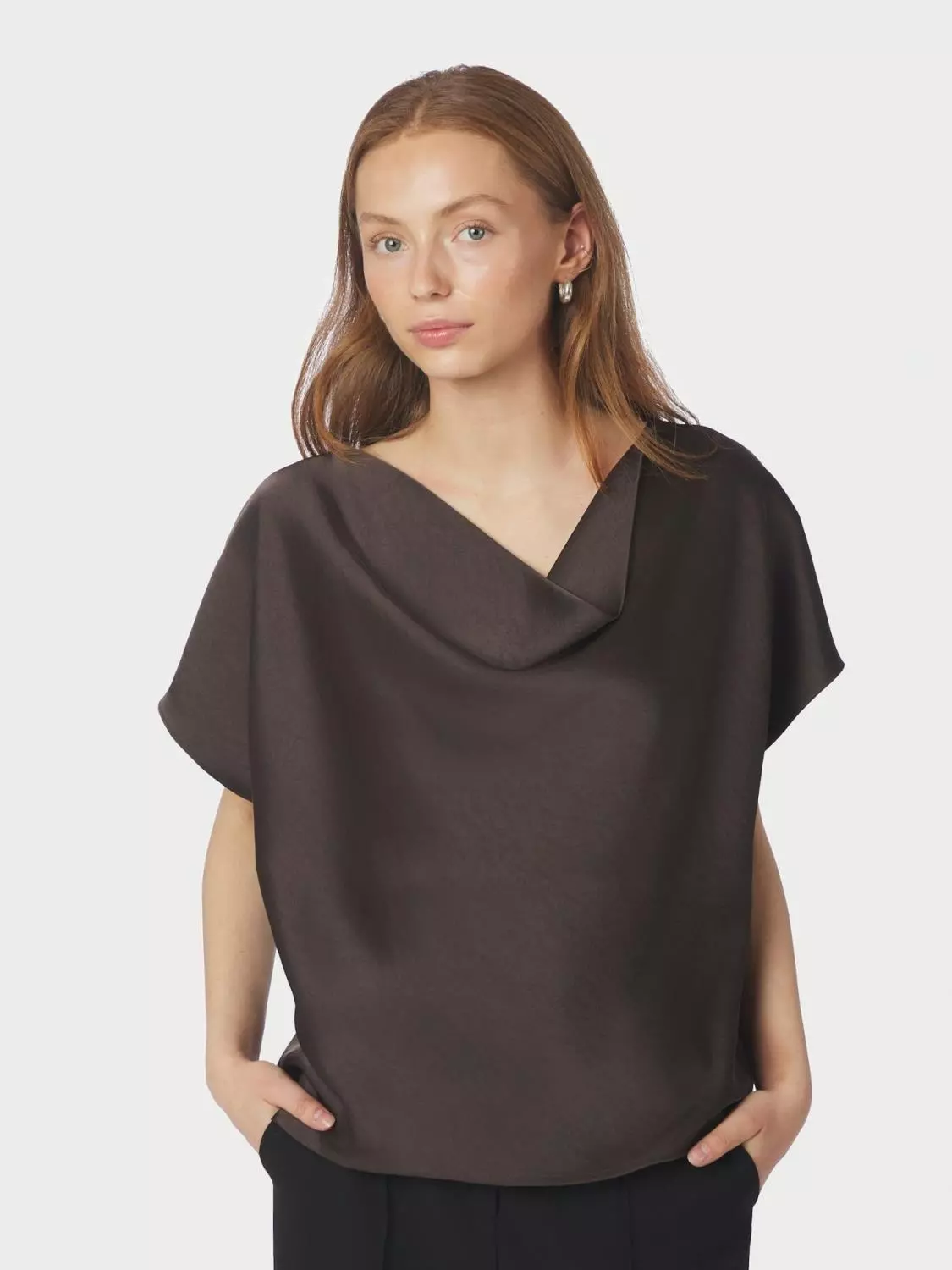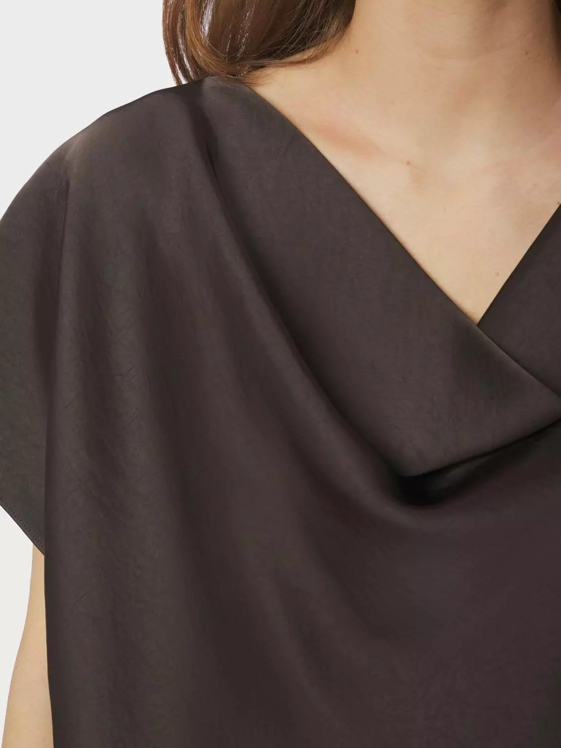 Elegant og enkel sateng topp med vakre draperingsdetaljer foran. Kvaliteten er en myk sateng.
