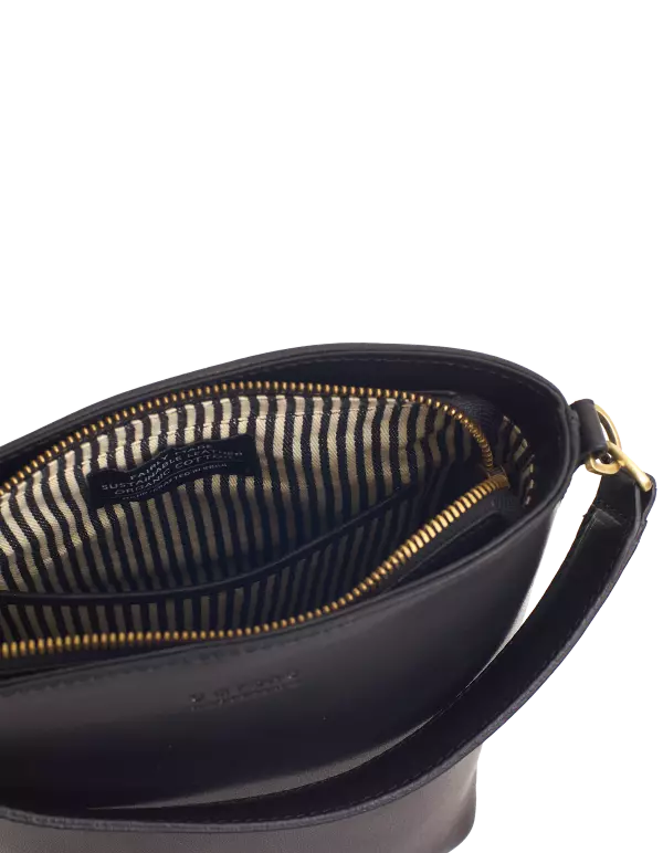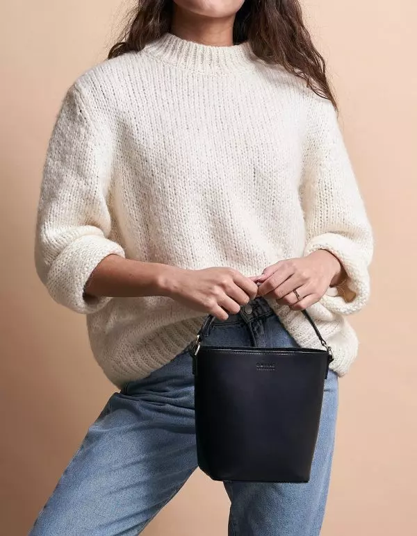 Denne stilige bøttevesken har ett romslig interiør og en glidelåslomme for å ta med deg de små tingene på et sekund.