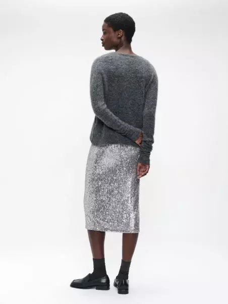 Gjør et glitrende statement denne sesongen med Dionisia-paljettskjørtet fra Jane Lushka. Dette rettskårne skjørtet er dekket av skimrende sølvpaljetter og tilbyr en flatterende silhuett som er både festlig og elegant. Det myke viskosefôret sikrer komfortabel bruk, mens lengden til midt på leggen gir et moderne preg.
