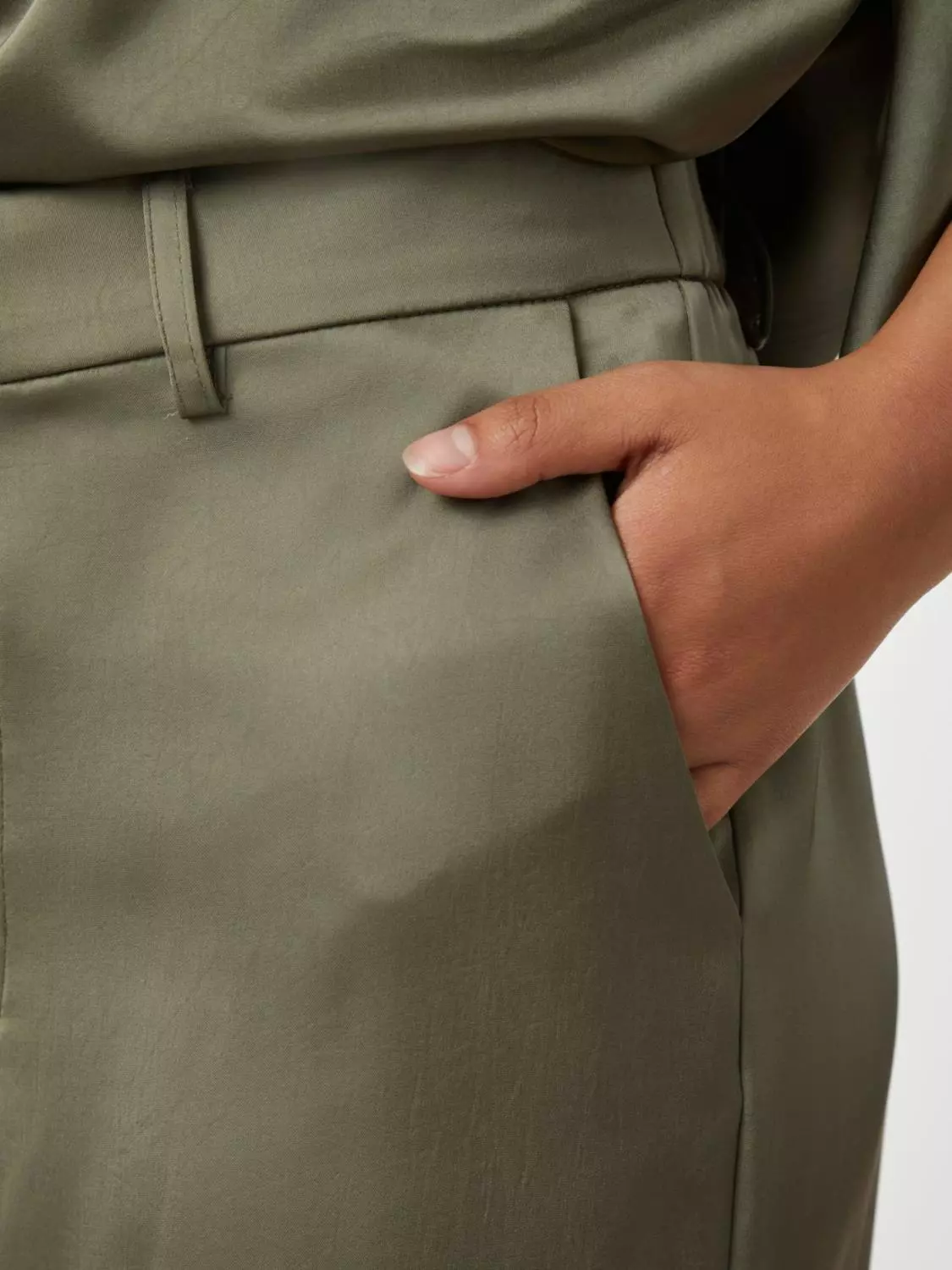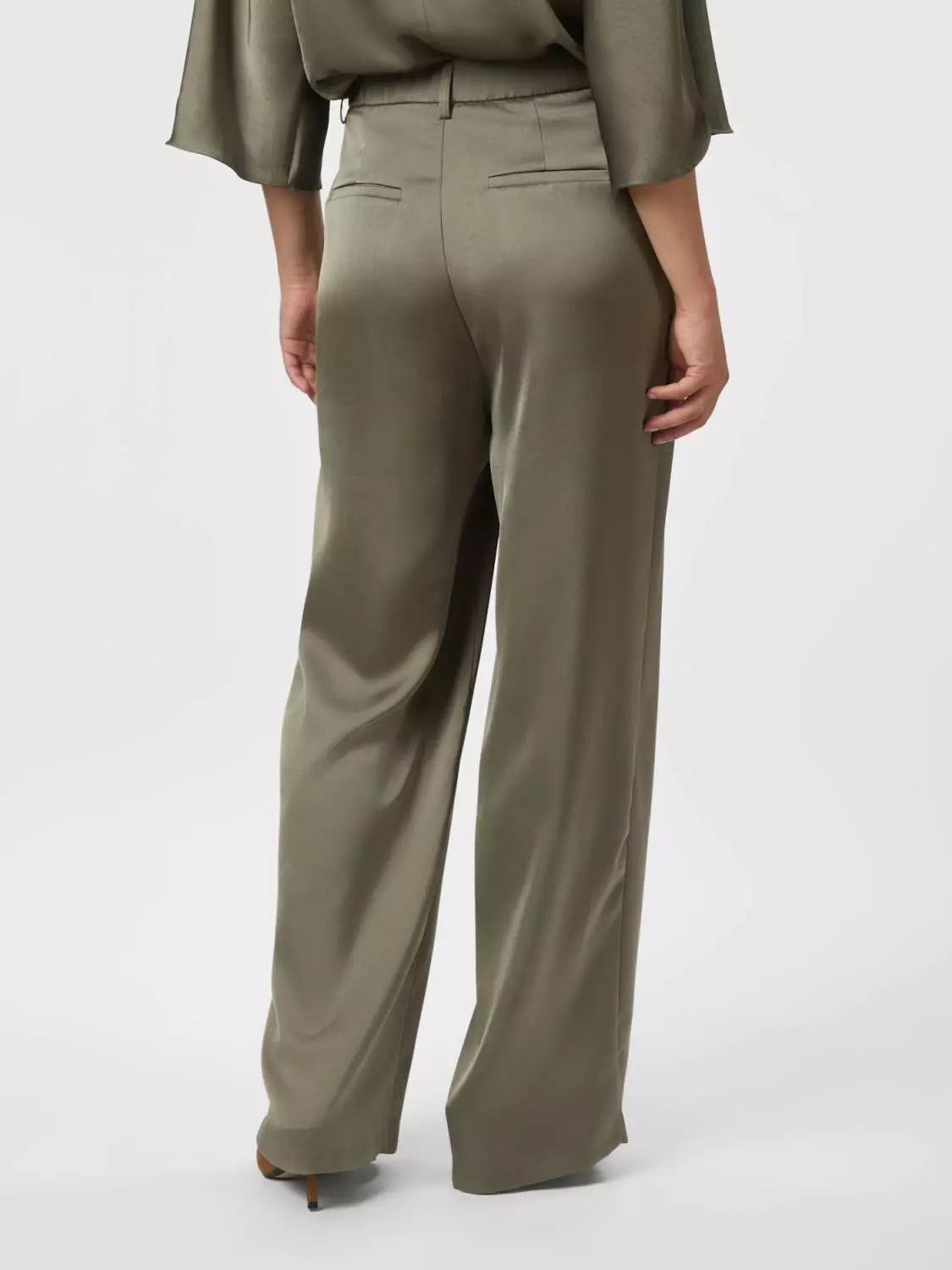 Kule bukser med vide ben og høy midje. Kommer i en fin, tung satin kvalitet. Modellen er 176 cm høy og bruker størrelse 36.