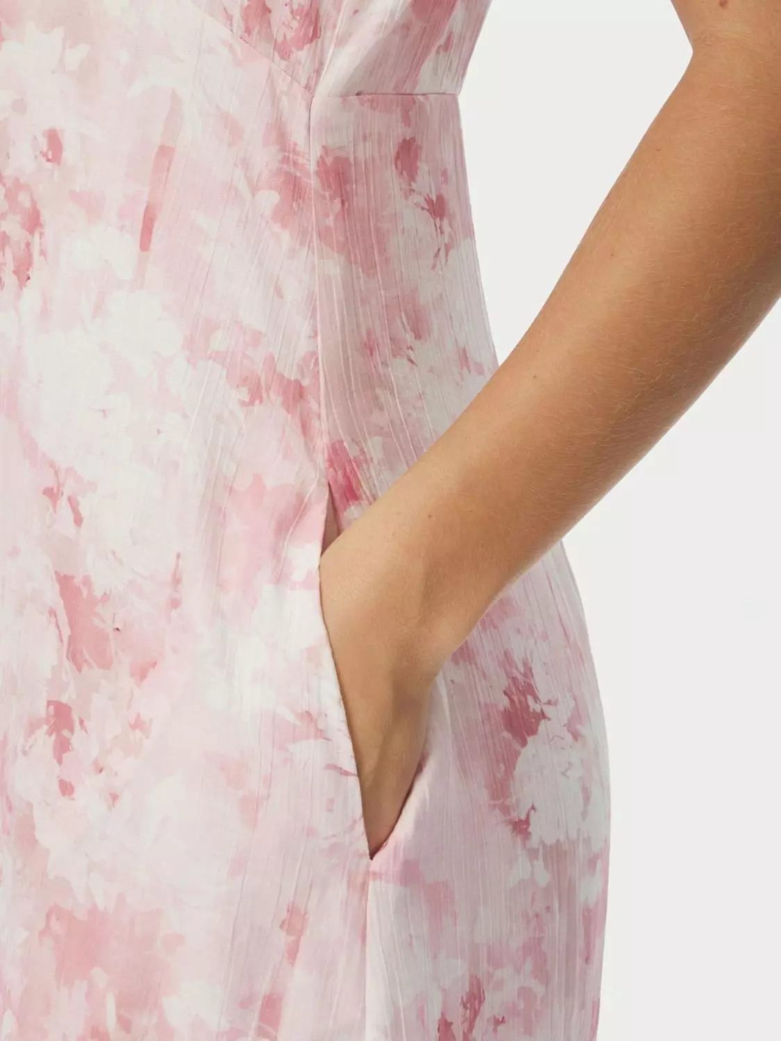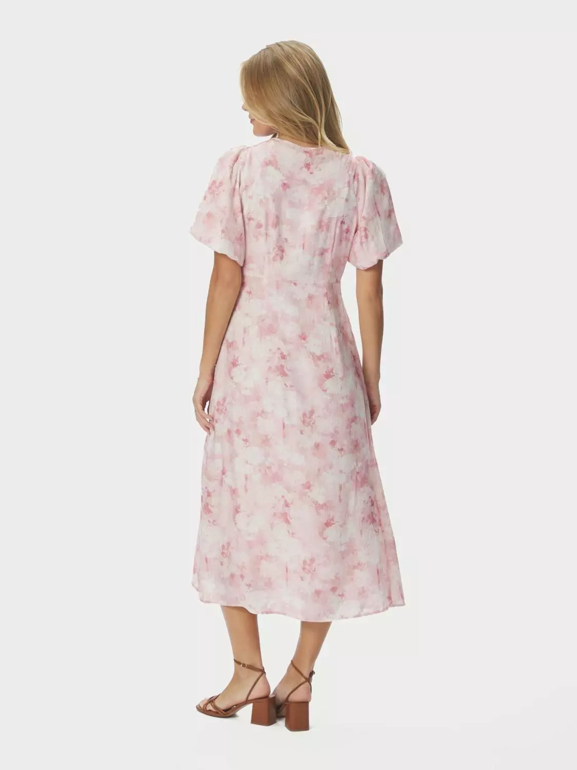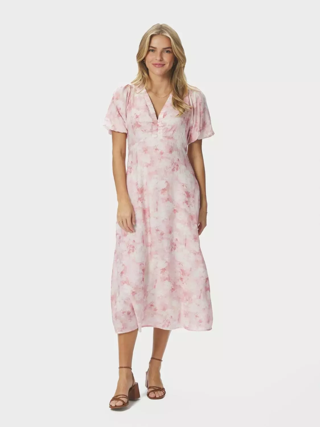 Søt lang kjole med v-hals, løse korte ermer og søm foran. Modellen er 176 cm og har på seg størrelse 36.