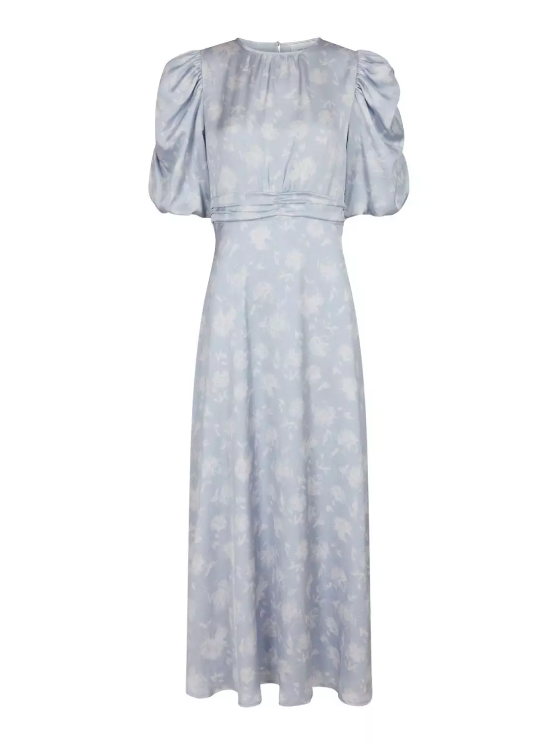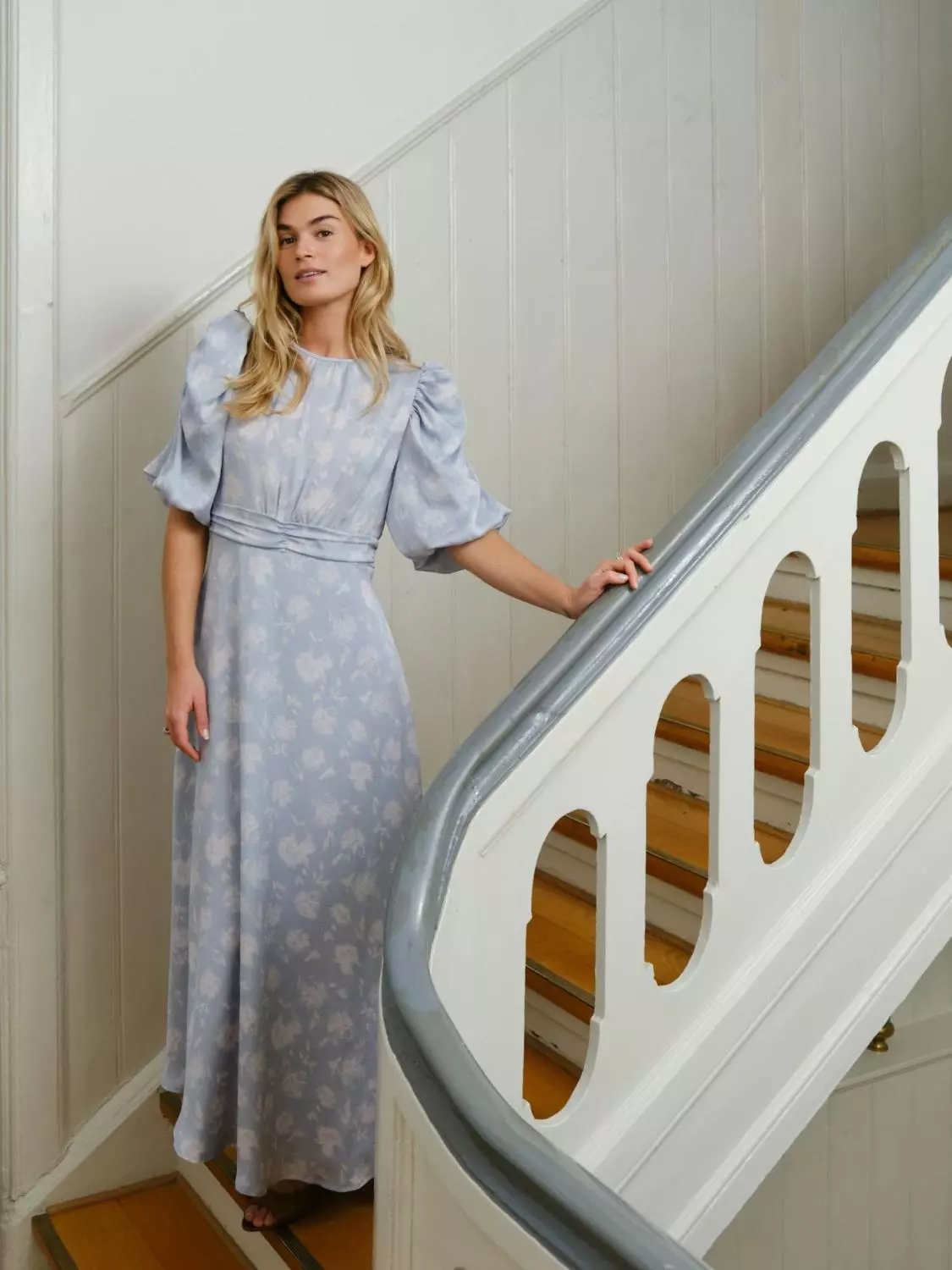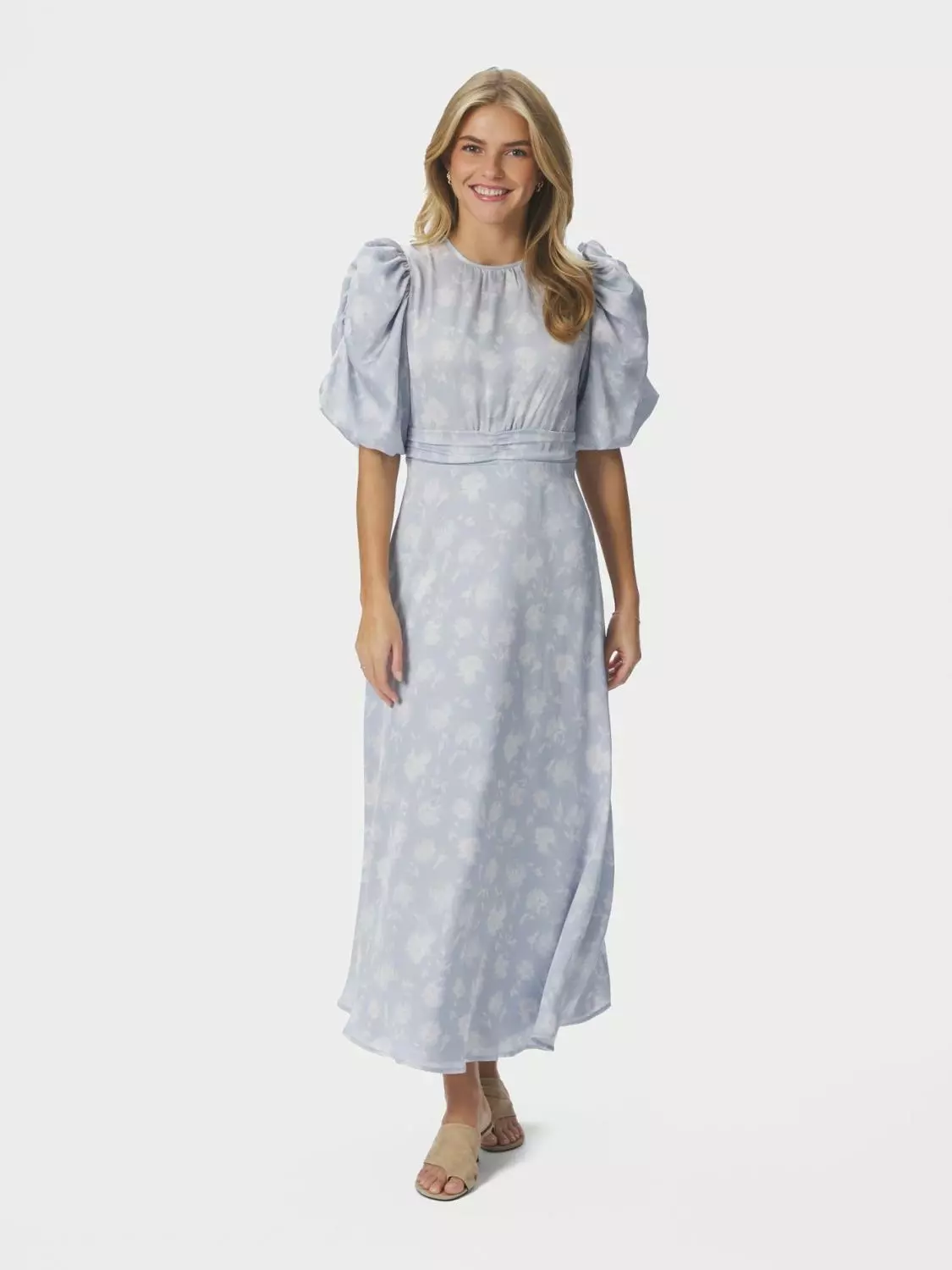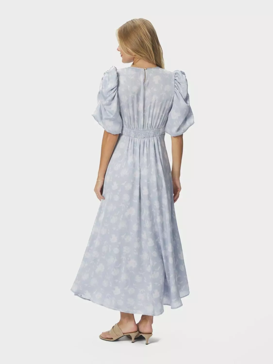 Nydelig, feminin lang kjole med et vakkert blomstermønster. Kjolen har 34-sleeves og smocking bak på livet. Kjolen har en knappelukking i halsen.