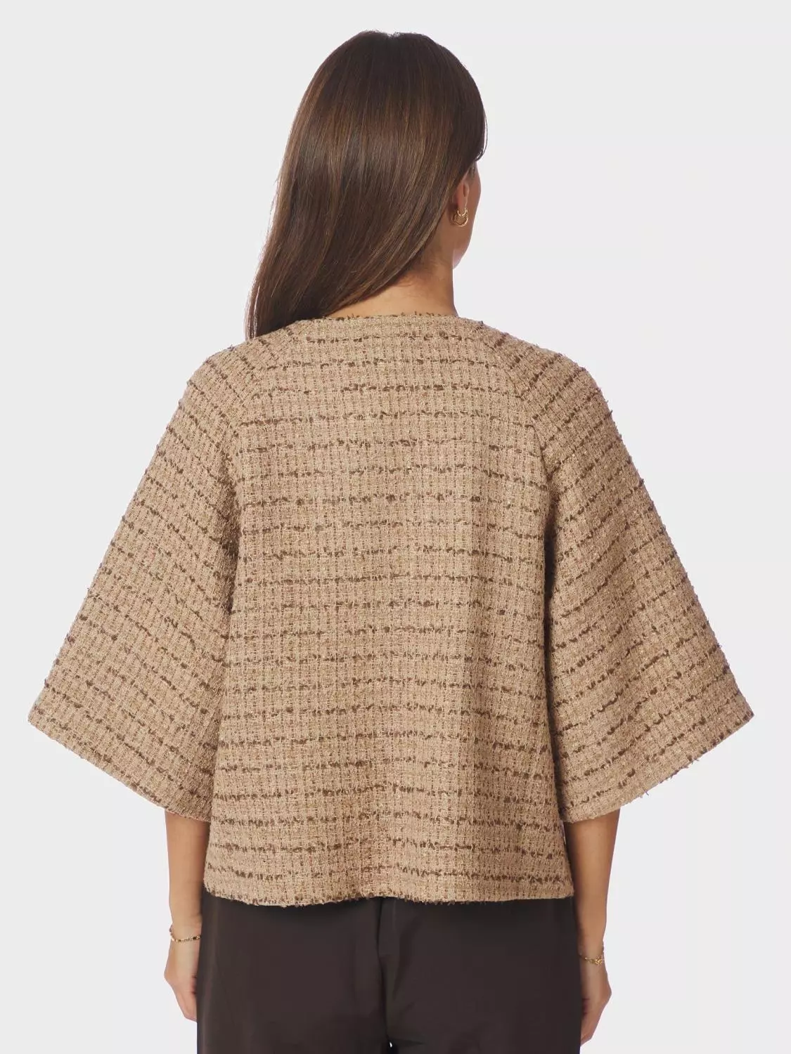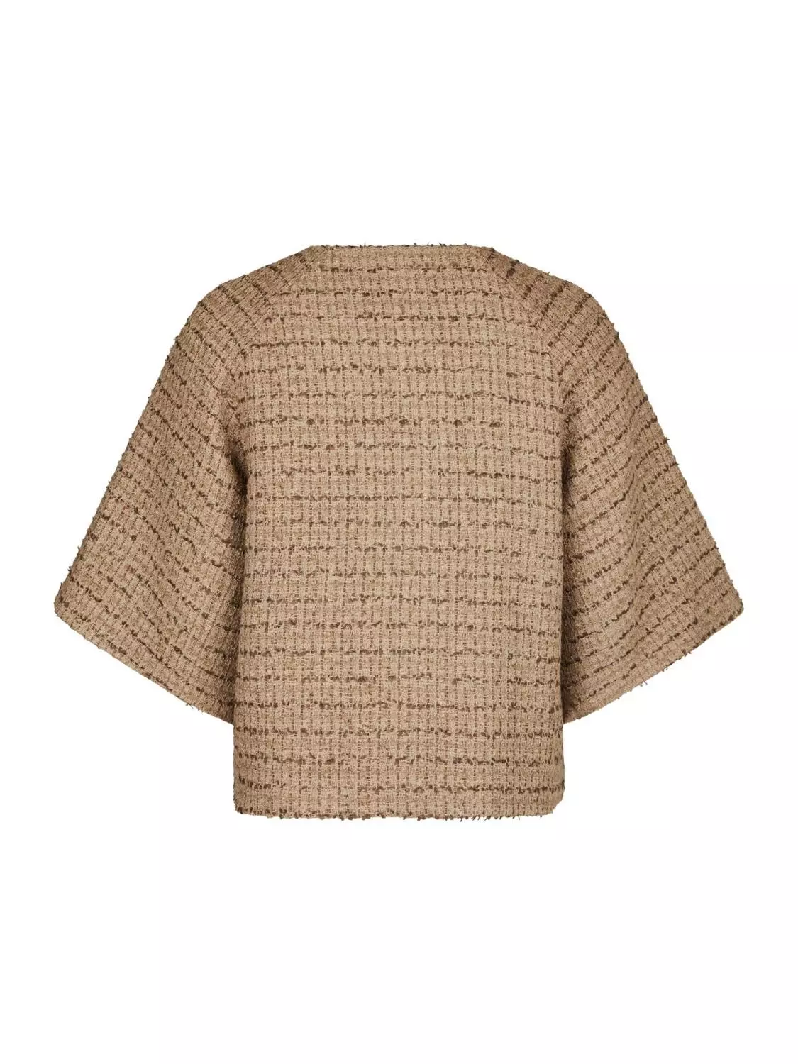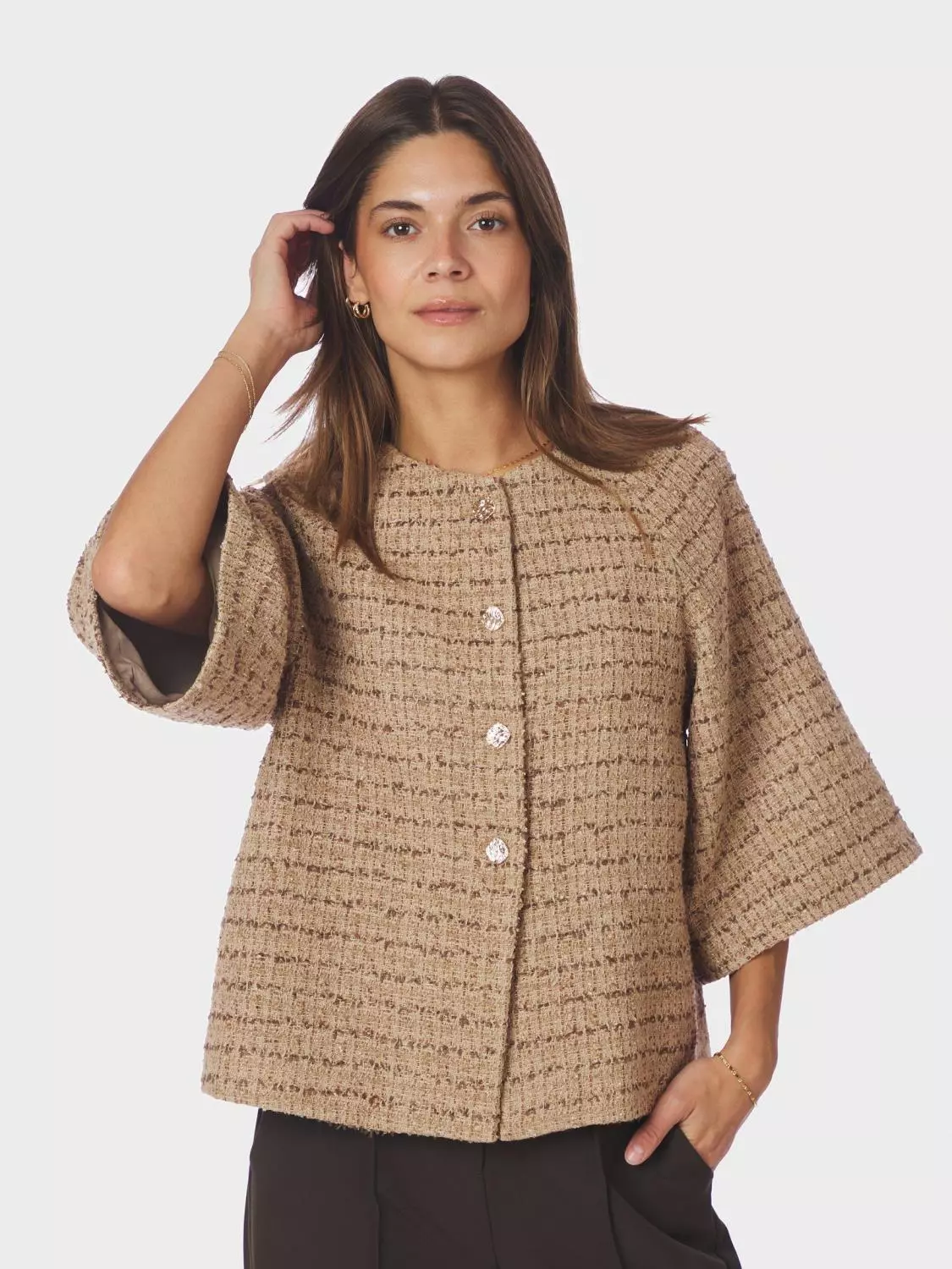 Superfin og elegant kort jakke. Jakken har halvlang, vid ermer. Den har en fin strukturert kvalitet og gullknapper. Modellen er 176 cm og bruker størrelse 36.