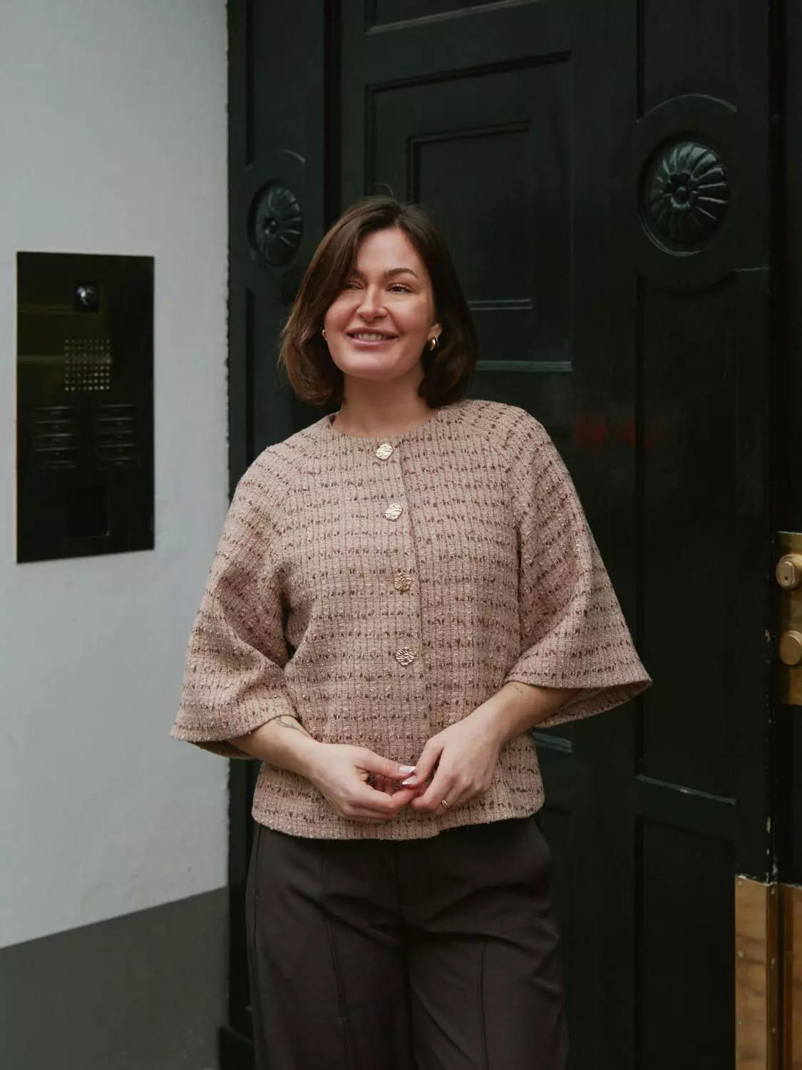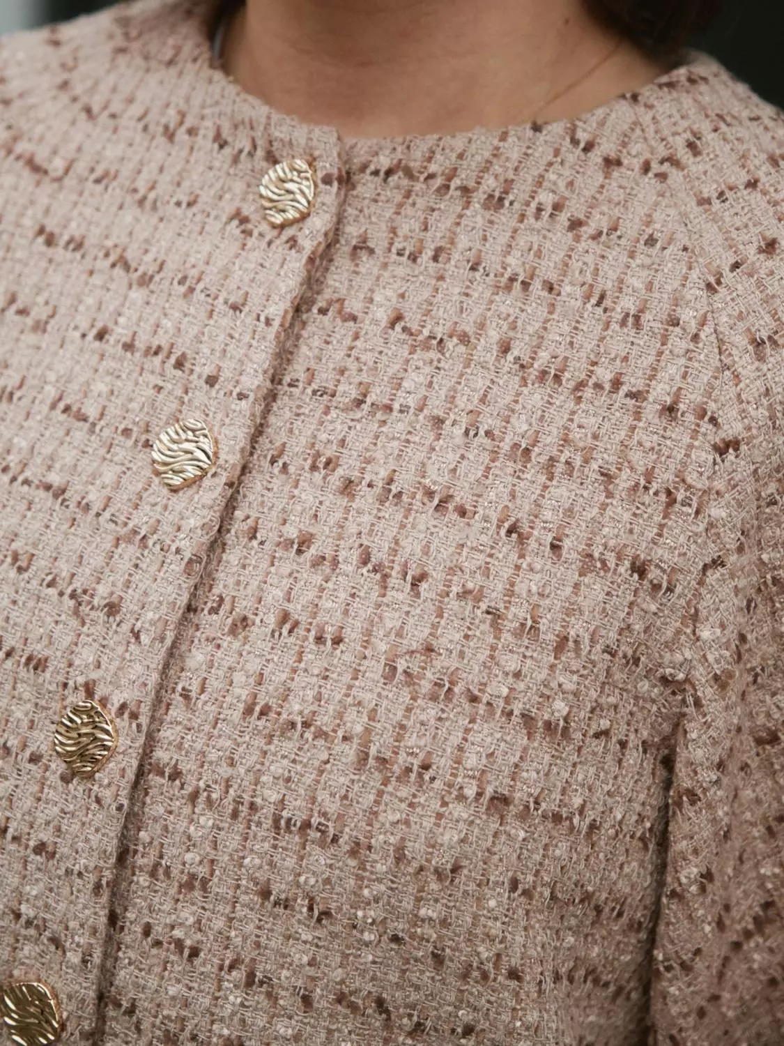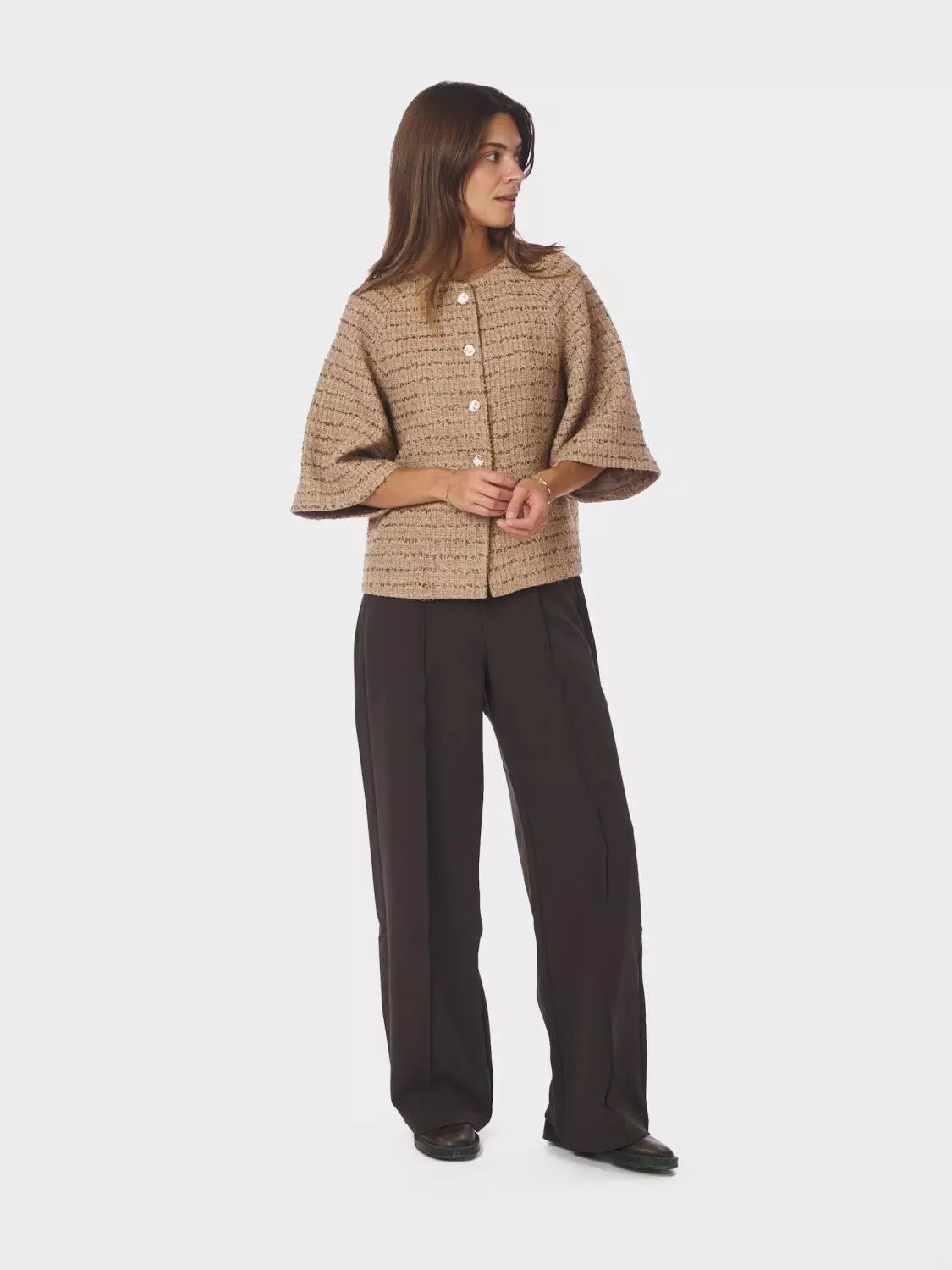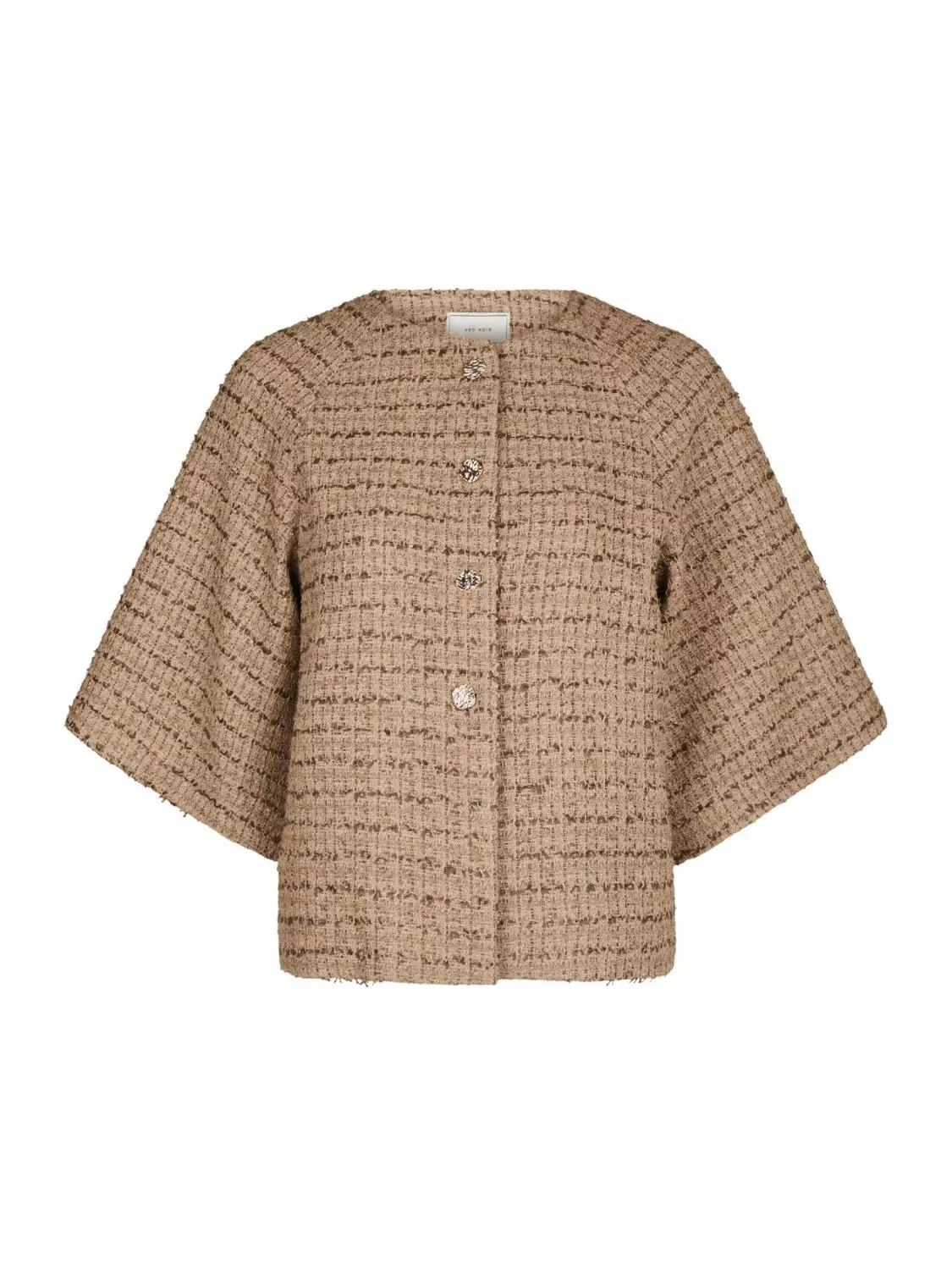 Superfin og elegant kort jakke. Jakken har halvlang, vid ermer. Den har en fin strukturert kvalitet og gullknapper. Modellen er 176 cm og bruker størrelse 36.