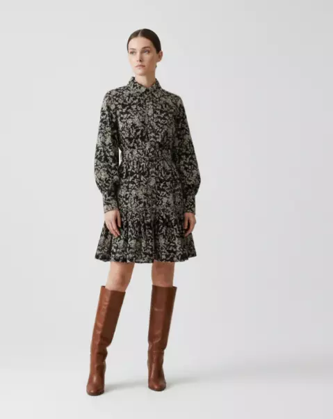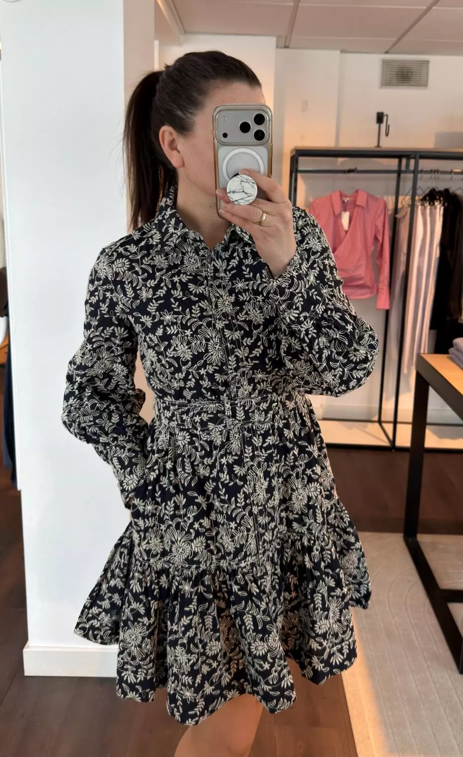 De broderte utsmykningene viser oppmerksomhet på detaljer og forvandler en klassisk skjortekjole til et raffinert basisplagg i garderoben.