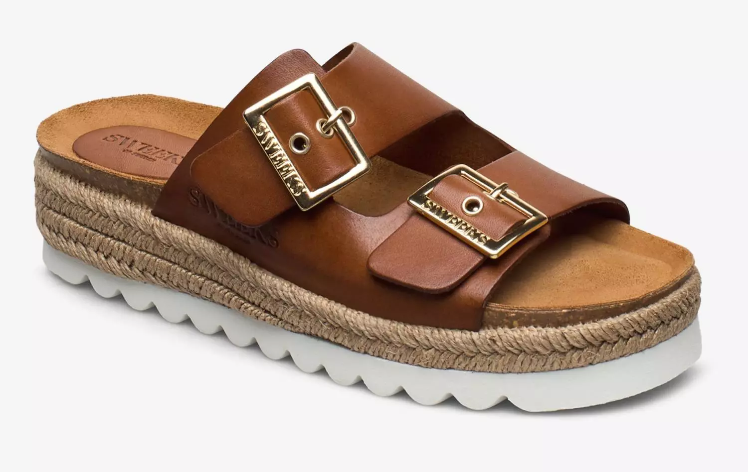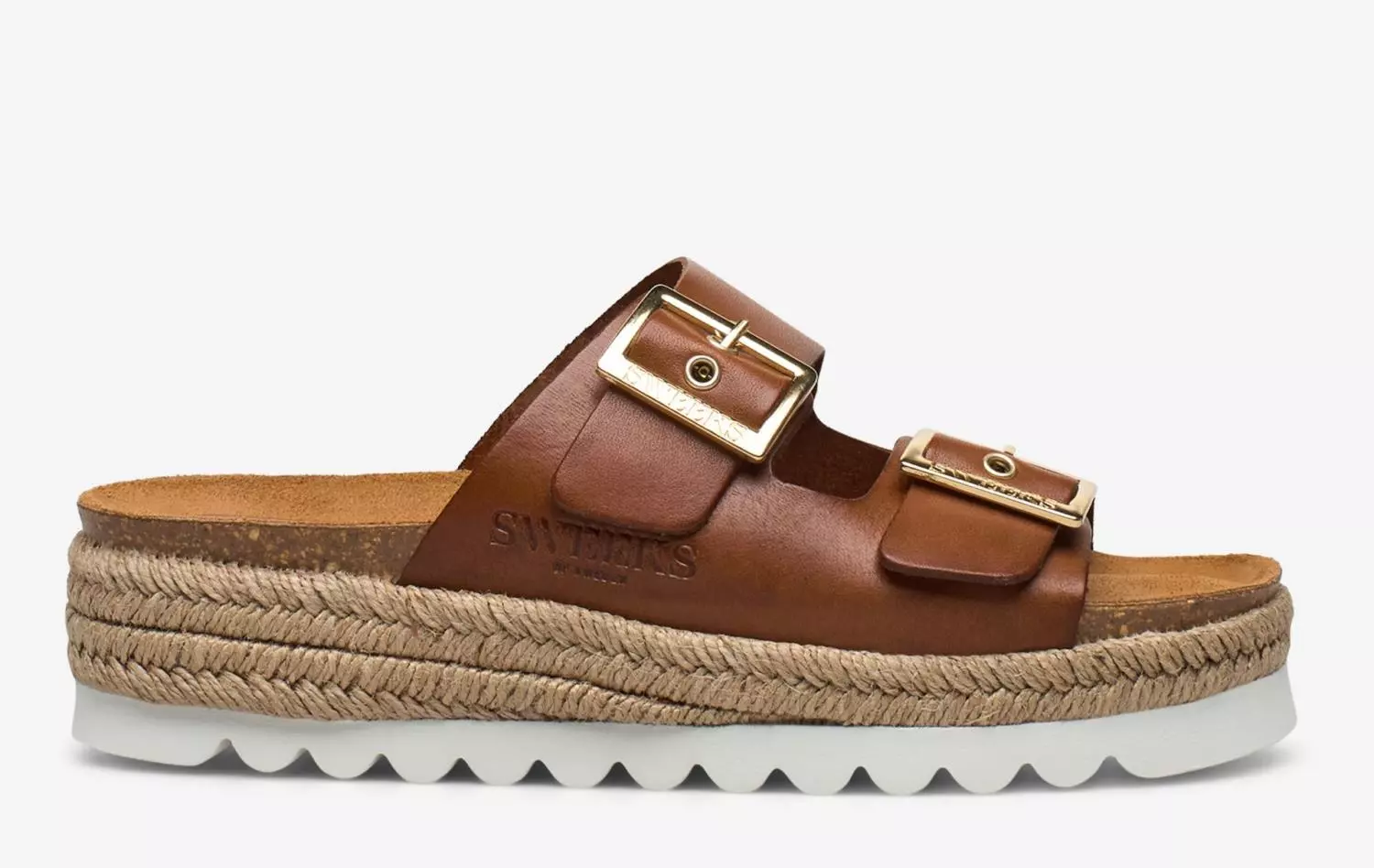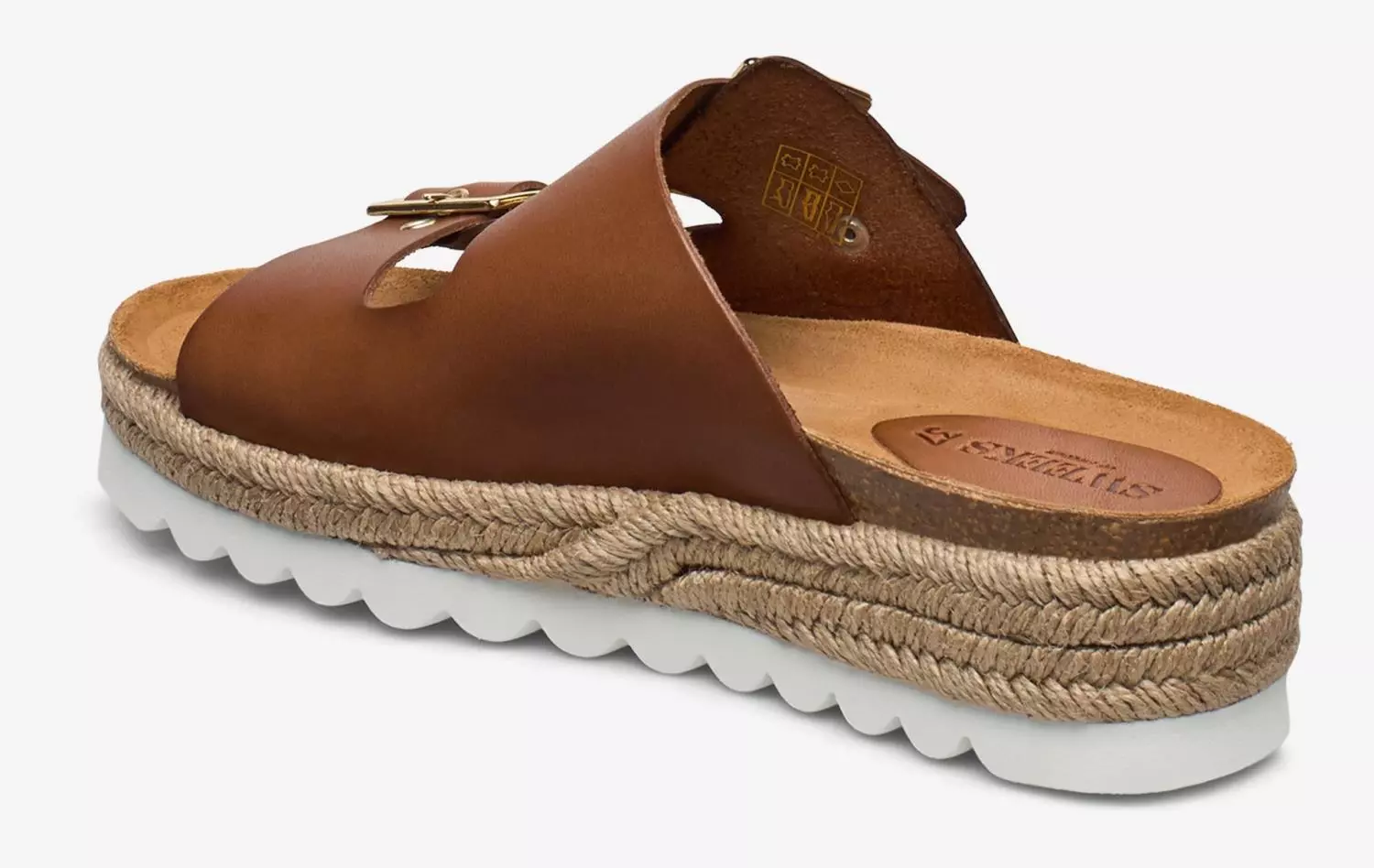 Sonja, sandaler fra Sweeks med taukile på hvit ribbet yttersåle. Slip-in modell med overdel i mykt skinn med dekorative spenner som kan justeres for best passform. Innersåle i kork trukket i mykt og behagelig semsket skinn. Sweeks er merket som puster sommer, modellene er designet for å passe både hverdag og fest.