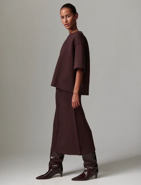 Dette midilange skjørtet har en elastisk scuba-tekstur og en lett A-formet silhuett. Det er en elastisk linning og hevede sømmer nedover midten. Skjørtet har en smal passform.