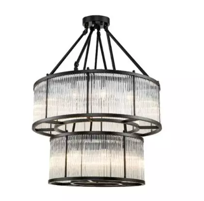 Den doble, sylinderformede konstruksjonen med vertikale glassstaver gir lampen et majestetisk uttrykk, der lyset reflekteres på en vakker og elegant måte. Rammen i svart metall omfavner klart, riflet glass, noe som skaper et luksuriøst og tidløst preg.